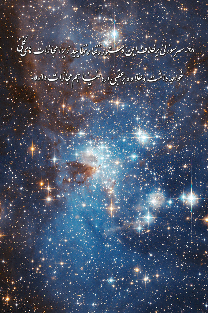 28- سر سوزنی بر خلاف این دستور رفتار ننمایید زیرا مجازات های کلّی خواهد داشت و علاوه بر عقبی در دنیا هم مجازات دارد. راه راست بدون امتیاز 945 بازدید اشتراک گذاری 28- سر سوزنی بر خلاف این دستور رفتار ننمایید زیرا مجازات های کلّی خواهد داشت و علاوه بر عقبی در دنیا هم مجازات دارد. مطلب قبلی مطلب بعدی دیدگاه ها ثبت دیدگاه