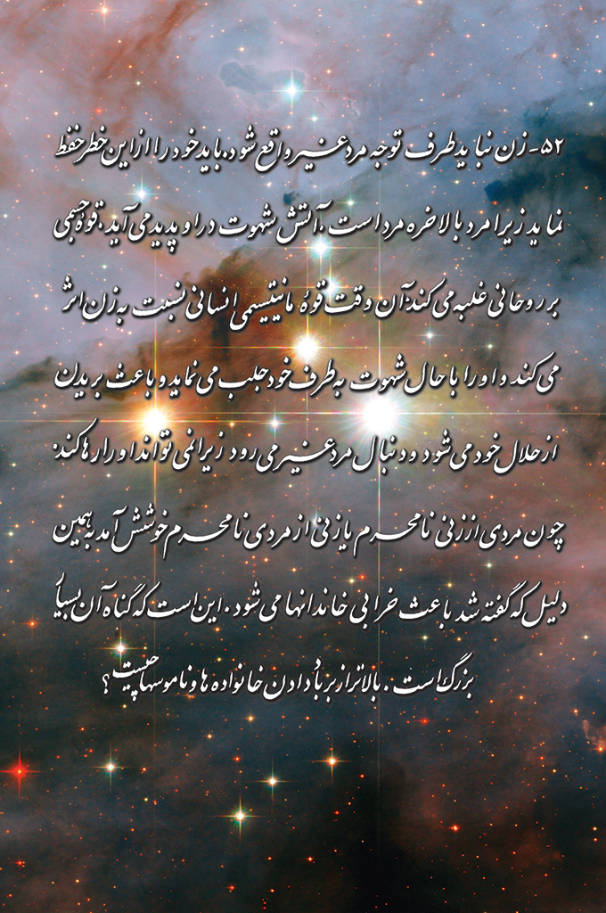52- زن نباید طرف توجه مرد غیر واقع شود. باید خود را از این خطر حفظ نماید زیرا مرد بالاخره مرد است.آتش شهوت در او پدید می آید. قوهٔ جسمی بر روحانی غلبه می کند.آن وقت قوهٔ مانیتیسمی انسانی نسبت به زن اثر می کند و او را با حال شهوت به طرف خود جلب می نماید و باعث بریدن از حلال خود می شود و دنبال مرد غیر می رود زیرا نمیتواند او را رها کند. چون مردی از زنی نامحرم یا زنی از مردی نامحرم خوشش آمد به همین دلیل که گفته شد باعث خرابی خاندانها میشود.این است که گناه آن بسیار بزرگ است. بالاتر از بر باد دادن خانواده ها و ناموسها چیست؟