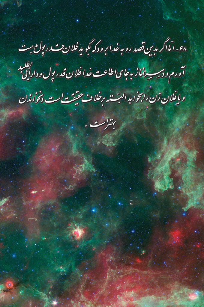 68- اگر سر نماز بجای اطاعت خدا ,پول و دارایی بطلبد نخواندن نماز بهتر است. راه راست 1نفر 1375 بازدید اشتراک گذاری 68- اما اگر بدین قصد رو به خدا برود که بگوید فلان قدر پول بدست آورم و در سر نماز به جای اطاعت خدا فلان قدر پول و دارایی بطلبد و یا فلان زن را بخواهد البته بر خلاف حقیقت است و نخواندن بهتر است. مطلب قبلی مطلب بعدی دیدگاه ها ثبت دیدگاه