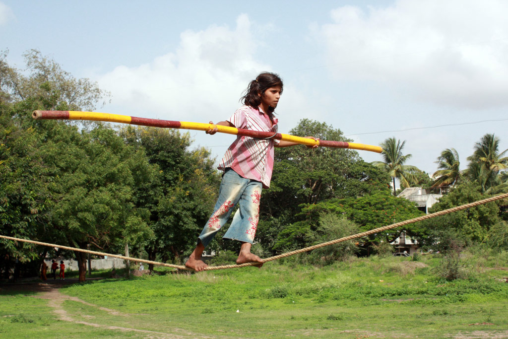 | حس تعادل - دختربچه هندی با استفاده از حس تعادل به راحتی بر روی این طناب قدم می زند. |