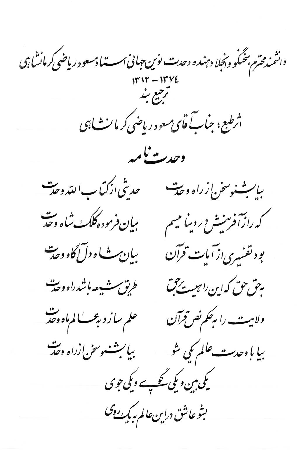 ترجیع بند اثر طبع:جناب آقای مسعود ریاضی کرمانشاهی - وحدت نامه مکانیسم آفرینش ملحقات چاپ سوم 1نفر 3554 بازدید اشتراک گذاری مطلب قبلی مطلب بعدی دیدگاه ها ثبت دیدگاه