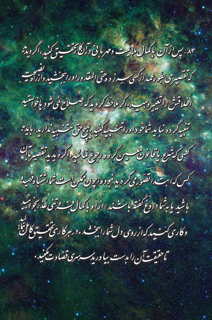83- پس از آن با کمال ملایمت و مهربانی در آن کار تحقیق کنید, اگر دیدید که تقصیری بطور عمد از کسی سر زده حتی المقدور او را ببخشید و از راه نصیحت اخلاقش را تغییر دهید. اگر ملاحظه کردید که اصلاح نمی شود یا خواستید تنبیه گردد نباید شما خود او را تنبیه کنید. هیچ حق تنبیه ندارید. باید به کسی که شرع یا قانون معین کرده رجوع نمائید. اگر دیدید تقصیر با آن کس که ابتدا تصّور می گردید نبوده(چون ممکن است شما اشتباه فهمیده باشید یا به شما دروغ گفته باشند) از او با کمال فروتنی عذر بخواهید و کاری کنید که از روی دل شما را ببخشد.در هر کاری تحقیق کامل بنمائید تا حقیقت آن را بدست بیاورید سرسرس قضاوت نکنید.
